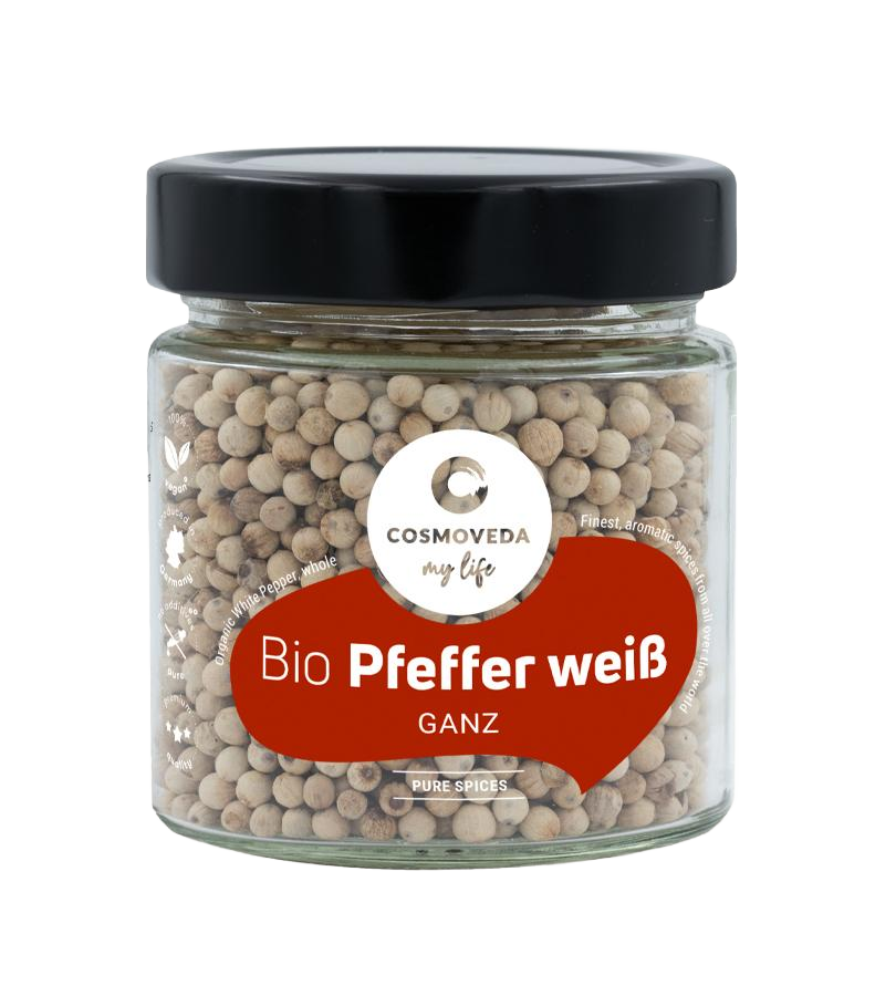 Cosmoveda's white pepper can be used in many different ways in the kitchen. Whether in savory dishes, salads or marinades - its subtle spiciness and spicy aroma enrich a variety of dishes. Grind the whole grains shortly before use to bring out the full flavor and health benefits.