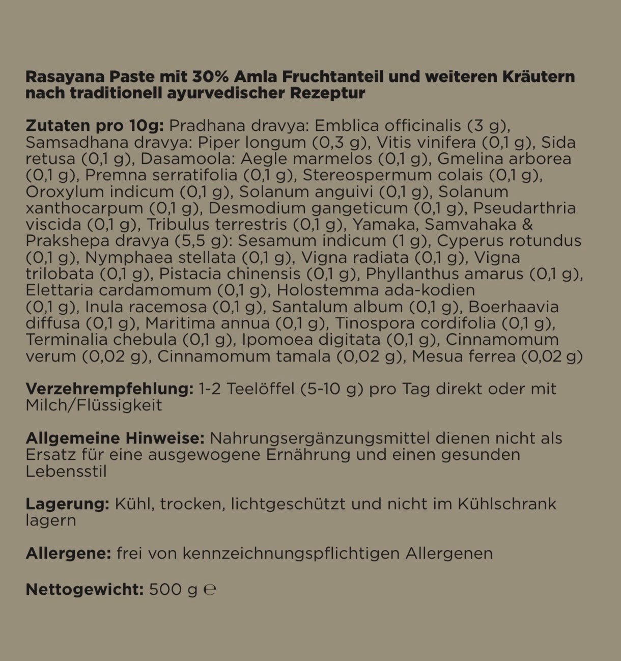 Ayurvedic Rasayana Chyawanprasam Gold LabelWith honey instead of simple sugar. Sanskrit: Cyavanaprāśa. To support the immune system. Contains important vitamins. In Ayurveda, it is one of the rasayanas.