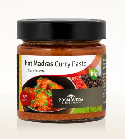 Die Cosmoveda Bio Hot Madras Curry Paste bringt südindisches Feuer in deine Küche! Mit feurigen Gewürzen, saftigen Tomaten und einer Prise Tamarinde peppt sie Dal, Gemüse und Fleischgerichte perfekt auf. Kurz Gemüse oder Fleisch mit Zwiebeln und Ingwer in Ghee anbraten, dann die Paste dazu – köcheln lassen und genießen! Für extra Geschmack gerne über Nacht marinieren. Ein Klecks Creme Fraiche oder Creamed Coconut macht die Sauce cremig-zart. Mit Reis serviert – dein würziges Curry-Abenteuer ist bereit!