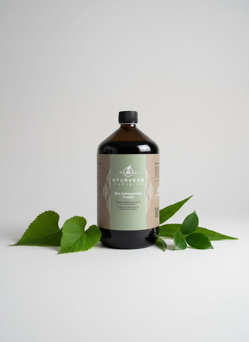 Balashwagandha Thailam fabriqué traditionnellement (Bala Ashvagandha ou Balaashwagandha) en flacon médical de 1 litre avec bouchon de sécurité : Balashwagandha peut favoriser la santé musculaire, pour un cycle de sommeil régulier, réduit le Vata. Il est utilisé pour la tête et le corps en Ayurveda. Très adapté aux sportifs.