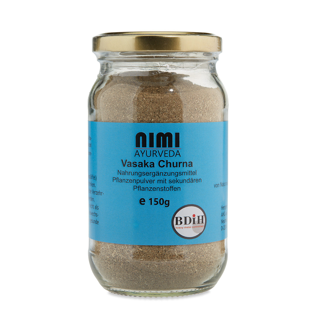 Für das Vasaka Churna Premium von Nimi Ayurveda wird die ganze Pflanze (ohne Wurzel) des Malabarnußbaums (auch Adusa genannt, botanischer Name Adhatoda vasica) aus kontrolliertem Anbau verwendet.