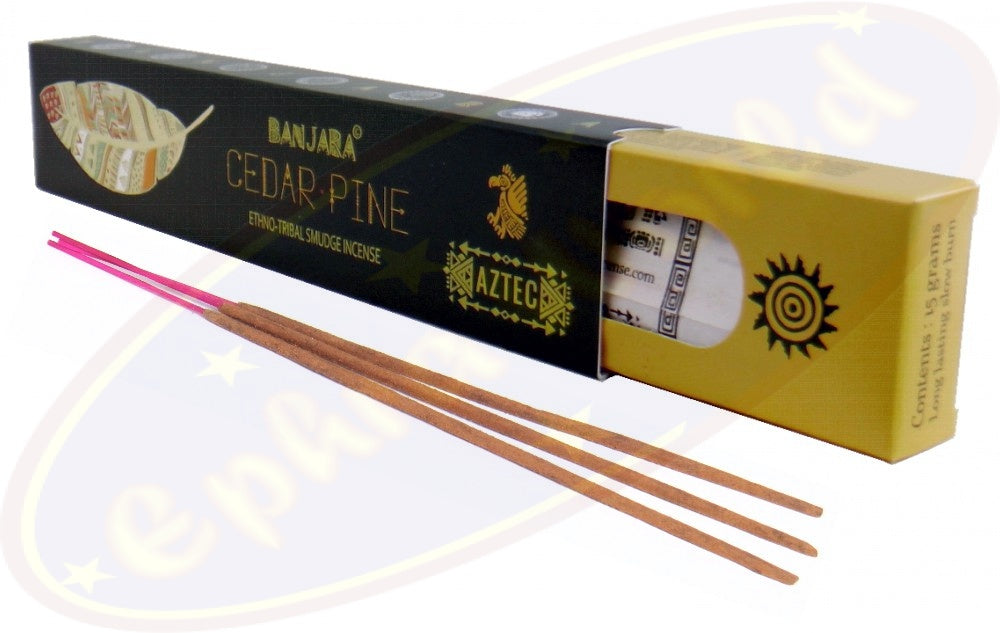 Aztec Banjana Cedar Pine Ethno-Tribal Smudge Incense Masala Räucherstäbchen - Banjara Cedar und Pine, Zedern und Kiefern sind zwei süß duftende Nadelhölzer aus der Familie der Kieferngewächse, Pinaceae. Sie symolisieren Beständigkeit und Selbstdisziplin und stehen für eine glückliche Ehe und ein langes Leben.