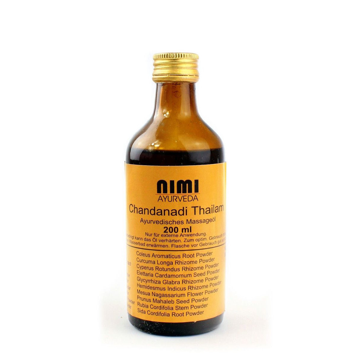 Chandanadi Thailam von Nimi Ayurveda ist ein traditionelles ayurvedisches Massageöl, das sehr gut für Dhara- und Shirodhara- (Stirnguss) Anwendungen verwendet werden kann. Es kann ebenfalls sehr gut als Haaröl verwendet und auch zur Massage des gesamten Körpers eingesetzt werden. Gleichzeitig eignet es sich auch gut für Nasya-Anwendungen im Innenbereich der Nase.